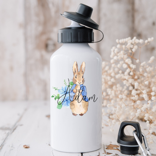 Sød og personlig drikkedunk + termoflaske med eget navn. Den fine flaske med Peter kanin har en smart karabinhage i metal, så man kan hænge den nemt på tasken eller barnevognen når man er på tur. Personlig gave til barnedåb, babyshower eller fødselsdag. F