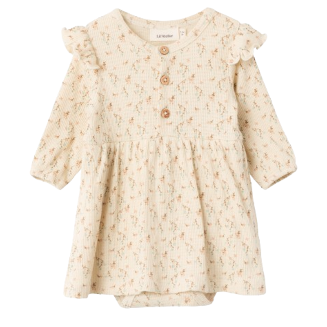 Denne Lil’ Atelier kjole med body er den perfekte kombination af stil og komfort til din lille pige. Med dens blomstermønster og praktiske design vil din baby se sød ud og føle sig godt tilpas hele dagen. Køb denne kjole i størrelse 56 i dag og gør din lille pige endnu mere bedårende!
